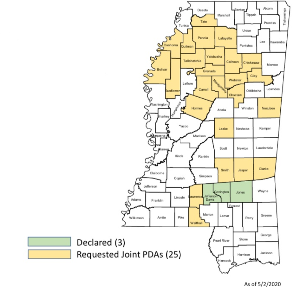 PEARL, Miss. - In April, MEMA requested Public and Individual Assistance for additional counties following the April 12, 2020 severe weather and tornadoes. As of now, Jones, Covington and Jefferson Davis Counties are the only counties that have been approved by FEMA to receive both Public and Individual Assistance.