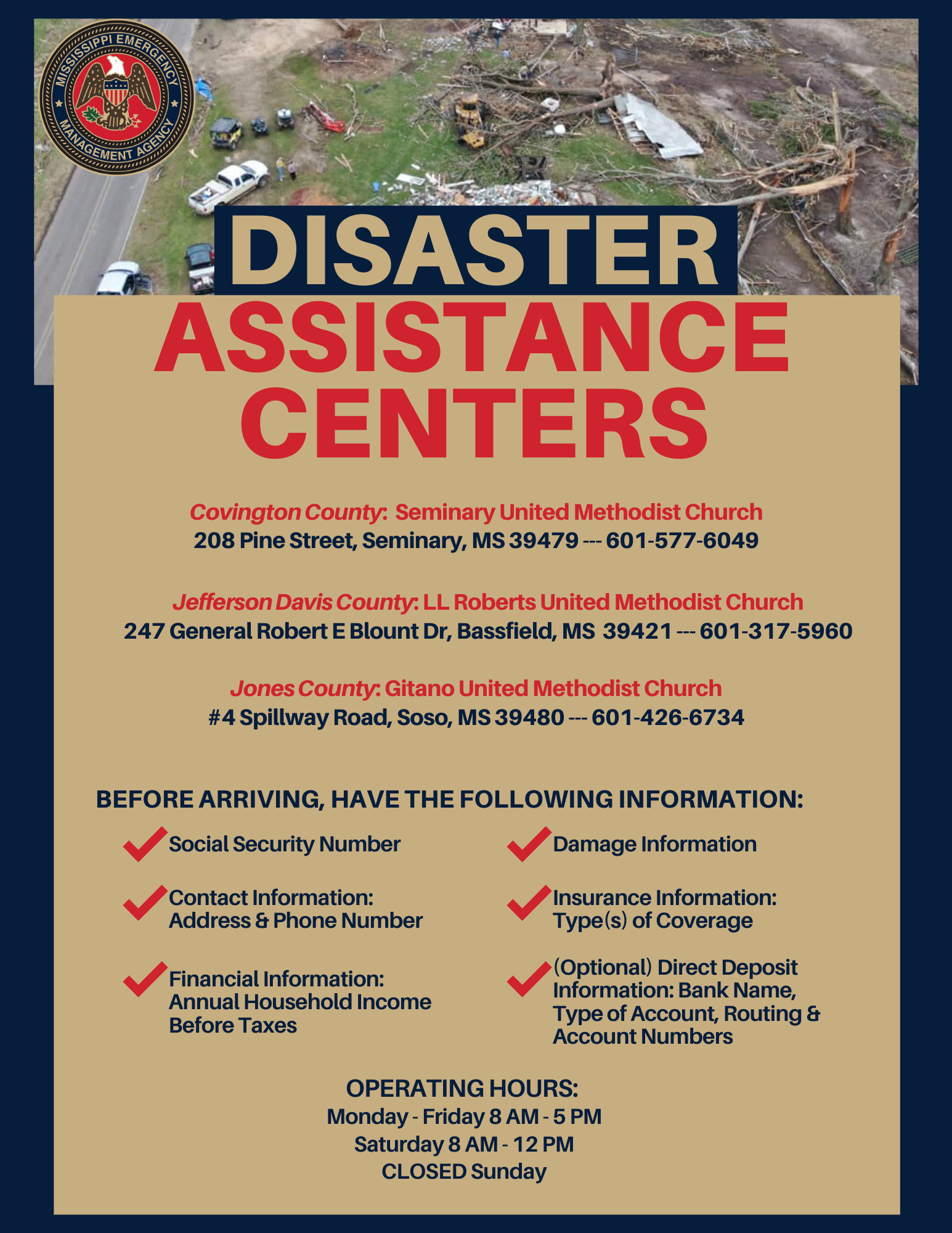 PEARL, Miss. – The Mississippi Emergency Management Agency, Mississippi Voluntary Organizations Active in Disasters (VOAD) and the United Methodist Committee on Relief (UMCOR) will open Disaster Assistance Centers in the counties that are declared federal disasters following the April 12, 2020, severe weather and tornadoes.