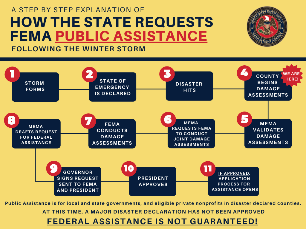 The Mississippi Emergency Management Agency is working with counties to assess reported damage. Those damage assessments will be used to determine if the state is eligible for federal public assistance for local and state governments. Here’s a look at where the state is in applying for PUBLIC ASSISTANCE: