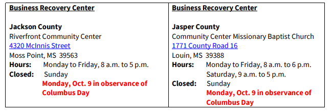 ATLANTA – The U.S. Small Business Administration (SBA) announced today it is temporarily closing its Business Recovery Centers (BRCs) in Jackson County and Jasper County on Monday, Oct. 9 in observance of the Columbus Day holiday. The Centers will resume normal operations on Tuesday, Oct. 10.